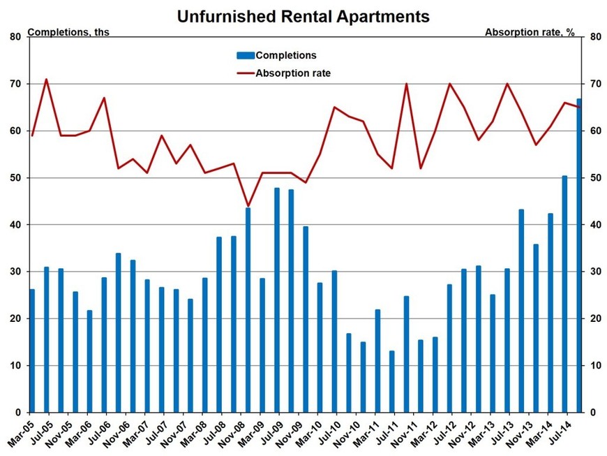 Rental absorption rates are stable as multifamily completions continue to rise. The condo/co-op market nationally is seeing a drop in absorption, down to 59% of completions. This is despite the fact that completions are at a historical low.