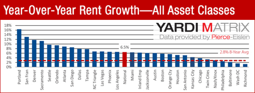 U.S. multifamily rent growth remains strong, with average nationwide rents rising by $7 in August to a record-high $1,162, according to the August edition of Matrix Monthly, a report on U.S. multifamily market trends from Yardi that was released Monday. The increase matched the 6.5 percent year-over-year increase in July.